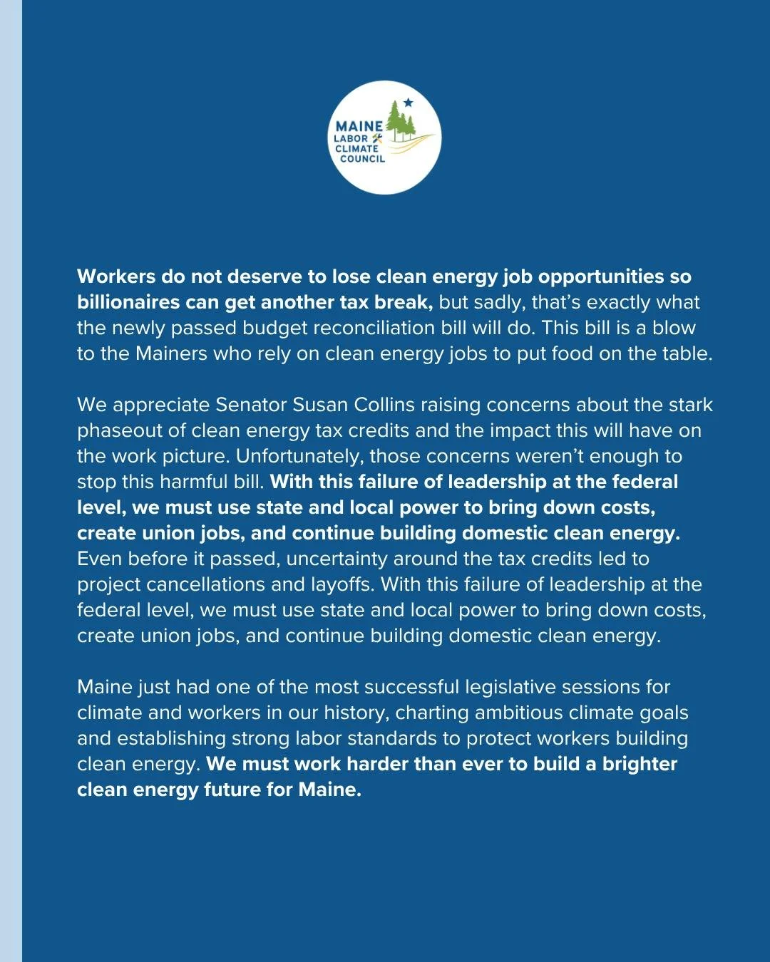 We are a coalition of Maine labor unions representing working Mainers across our state. We seek to develop the labor movement’s vision for how to tackle the twin crises of climate change and inequality in a way that creates good Maine union jobs, reduces carbon emissions and economic inequality, and provides a seat at the table for workers and unions in this process. By educating fellow workers, building alliances, and advocating for policy solutions our work shows that we do not have to choose between a healthy planet and good jobs that sustain our families and communities.
